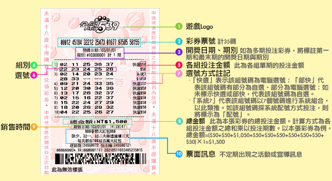 注意事項:彩券銷售後如遇有加開期數之情況,預購及多期投注之期數將順延。若彩券上的資料和電腦紀錄的資料不同,以電腦紀錄資料為準。